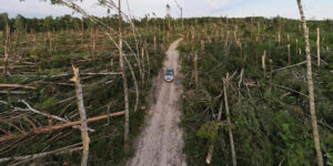 На одном отрезке пути дорога становилась грунтовой и проходила через густой хвойный лес. Проехать по ней и в хорошую погоду было сложно, за руль сажали только опытных водителей и ехали очень медленно. Но в этот раз картина за окнами была просто зловещей: как в фантастических фильмах, высокие старые деревья были срезаны пополам. Не только большие ветки, но даже толстые стволы беспорядочными кучами валялись повсюду и напоминали прошедшее побоище.